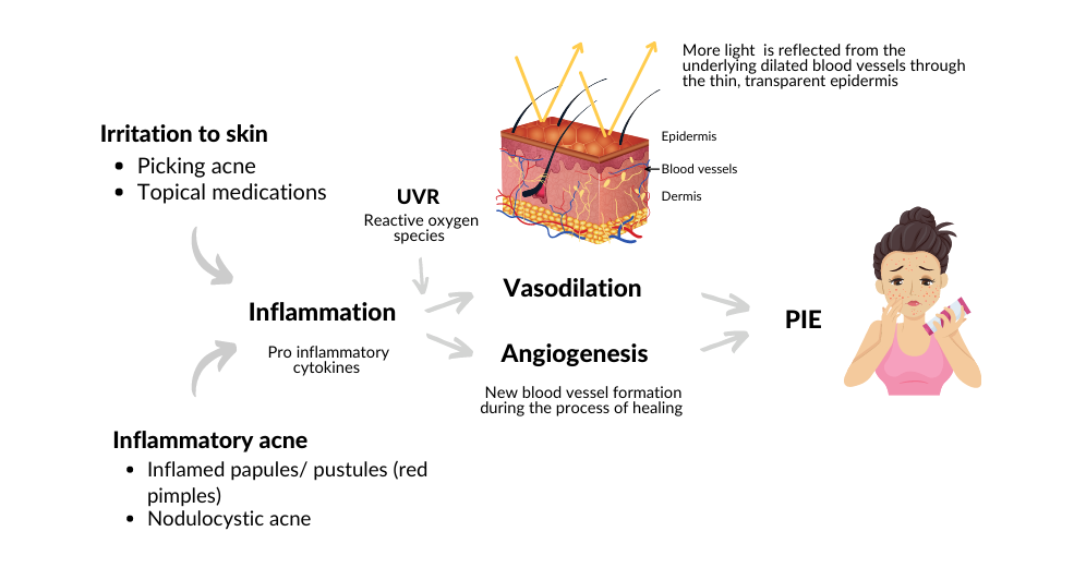 Ngoài ra, hiện tượng đỏ kéo dài sau mụn (PIE) xuất hiện khi mao mạch giãn nở hoặc tổn thương, khiến da có màu hồng đỏ dù mụn đã xẹp.